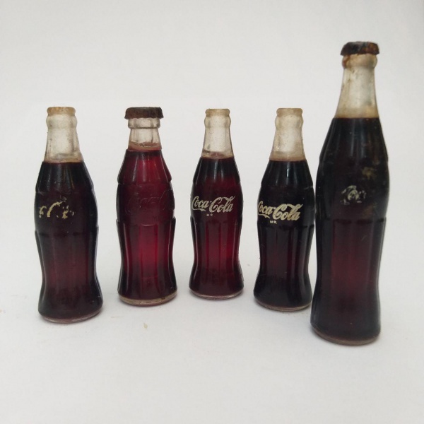 • LOTE COM 5 MÍNIS GARRAFAS COCA COLA DE BAQUELITE SENDO 1 TROLL.  4 UNIDADES SÃO COLEÇÃO ANOS 50 E UMA INDIVIDUAL TROLL.