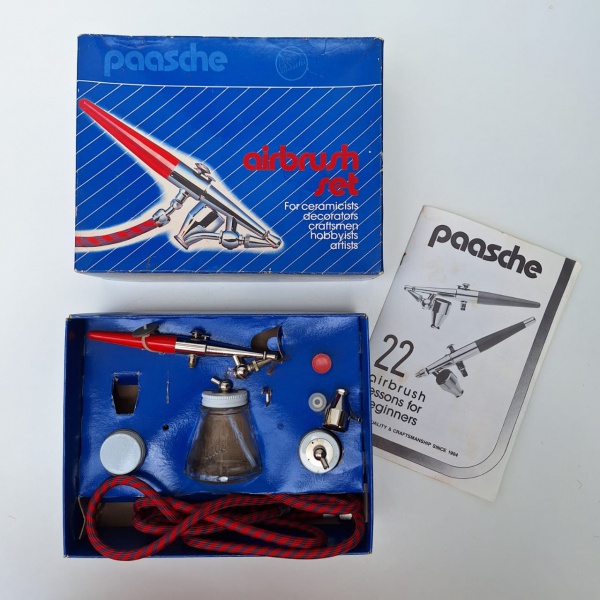 • Aerógrafo sem uso aparente, na caixa com acessórios. Marca PAASCHE. Peça no estado da foto, sem testes de funcionamento.
