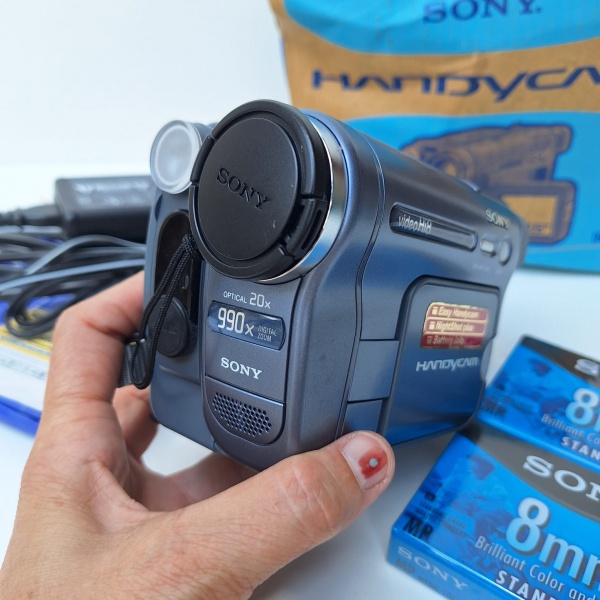 • FILMADORA SONY HANDYCAN analógica, na caixa com manual, acessórios e filmes sem uso. Peça no estado das fotos, sem testes de funcionamento.