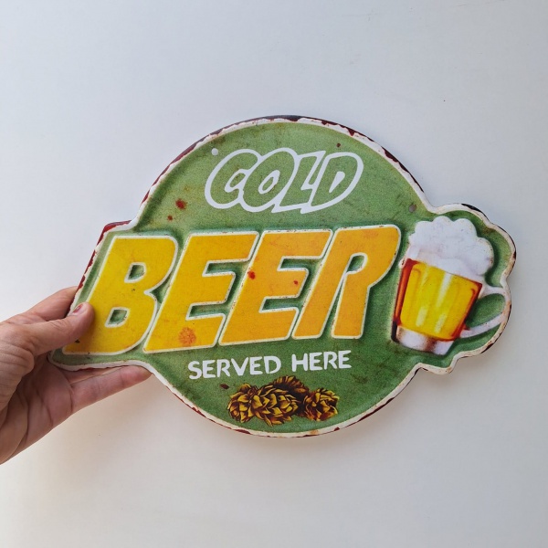 • Simpática placa para bar, em metal `COLD BEER SERVED HERE`. Medida: 34x23cm. . Peça no estado das fotos.