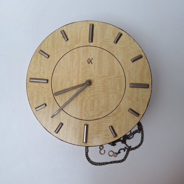 • Curioso RELÓGIO de parede, com visor de fórmica bege. Sem marca definida. Peça no estado das fotos, sem testes de funcionamento.