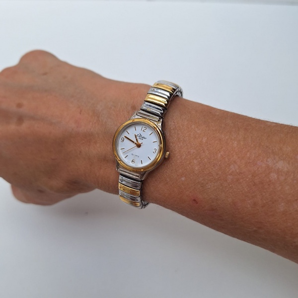 • Relógio Feminino, dourado e prateado com pulseira elástica. CONDOR NEW Quartz. Peça no estado das fotos, sem testes de funcionamento.
