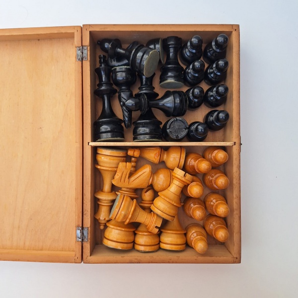 • Lindo JOGO DE XADREZ com peças completas de madeira na caixa. Antigos. Peça no estado das fotos.