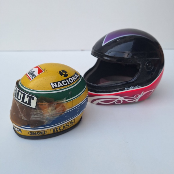 • Miniaturas decorativas de capacetes, (2). Ayrton Senna e outro sem definição. Peça no estado das fotos, sem testes de funcionamento.