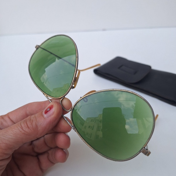 • Óculos de sol estilo Ray Ban Aviador (sem inscrição na peça) com lente de grau desconhecido verde. Peça no estado das fotos.