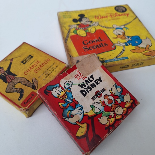 • Filmes Super 8, na caixa. Charlie Chaplin, Mickey Mouse e Pato Donald . Peças no estado das fotos, sem testes de funcionamento.